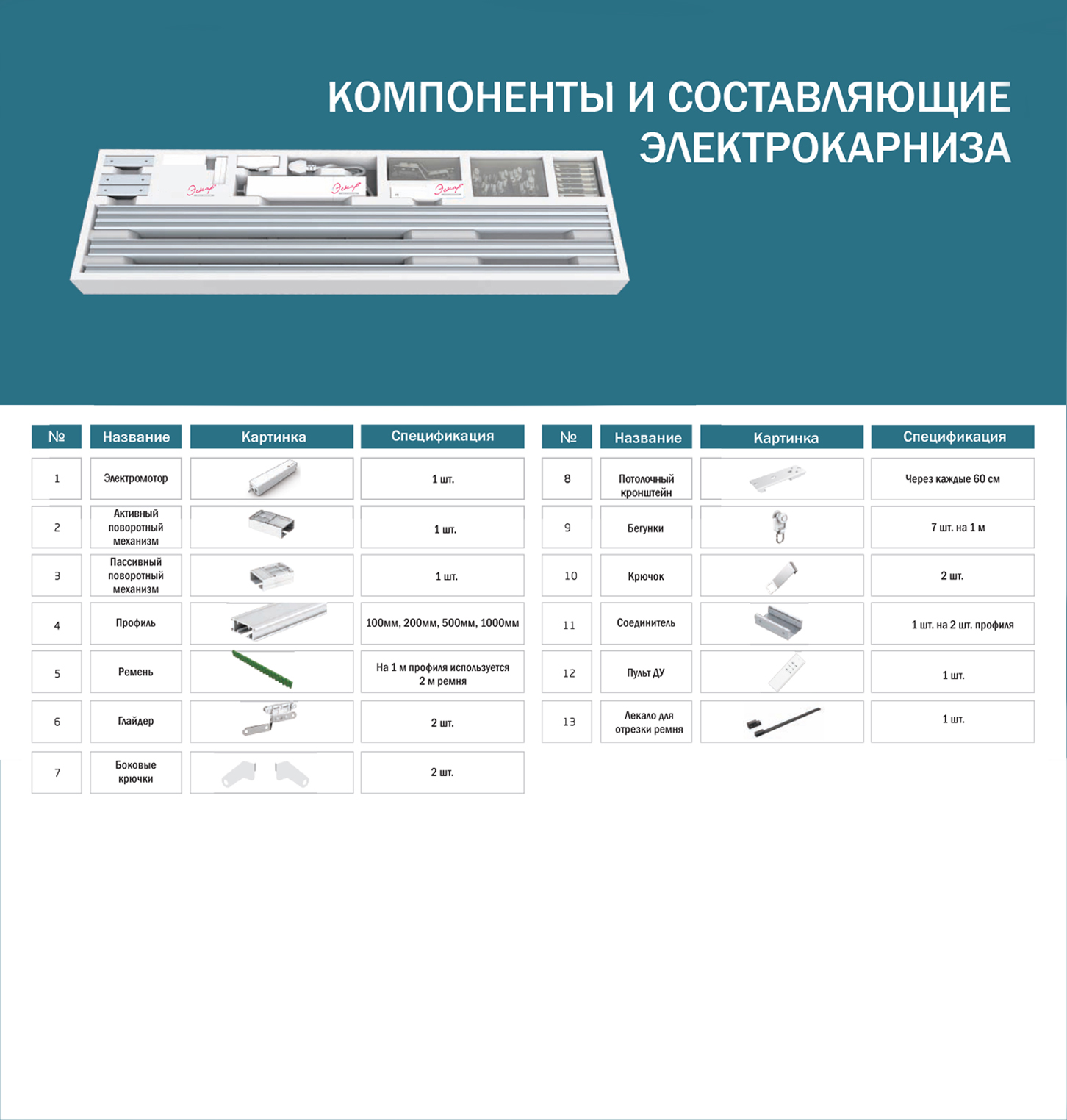 - Цвет профиля – белый- Цвет комплектующих – белыйПри заказе необходимо указать:- расположение мотора справа/слева- вариант раздвижки: от центра в стороны или в одну сторону вправо/влево.