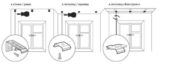 3. При установке на проем (на стену или на раму) дополнительно приобретаются Г-образные стеновые кронштейны (4), к которым прикручиваются болтом с гайкой потолочные кронштейны. Изделие должно быть установлено таким образом, чтобы в открытом состоянии ламели располагались на расстоянии не менее 2 см от отопительных приборов.