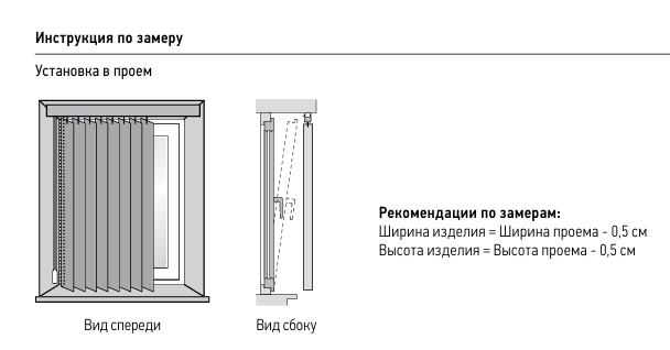 Определите, как вы планируете устанавливать жалюзи, и учитывайте габаритные размеры жалюзи: Ширина жалюзи = [Ширина проема] - 0,5-1 см, Высота жалюзи = [Высота проема] - 0,5-1,5 см.